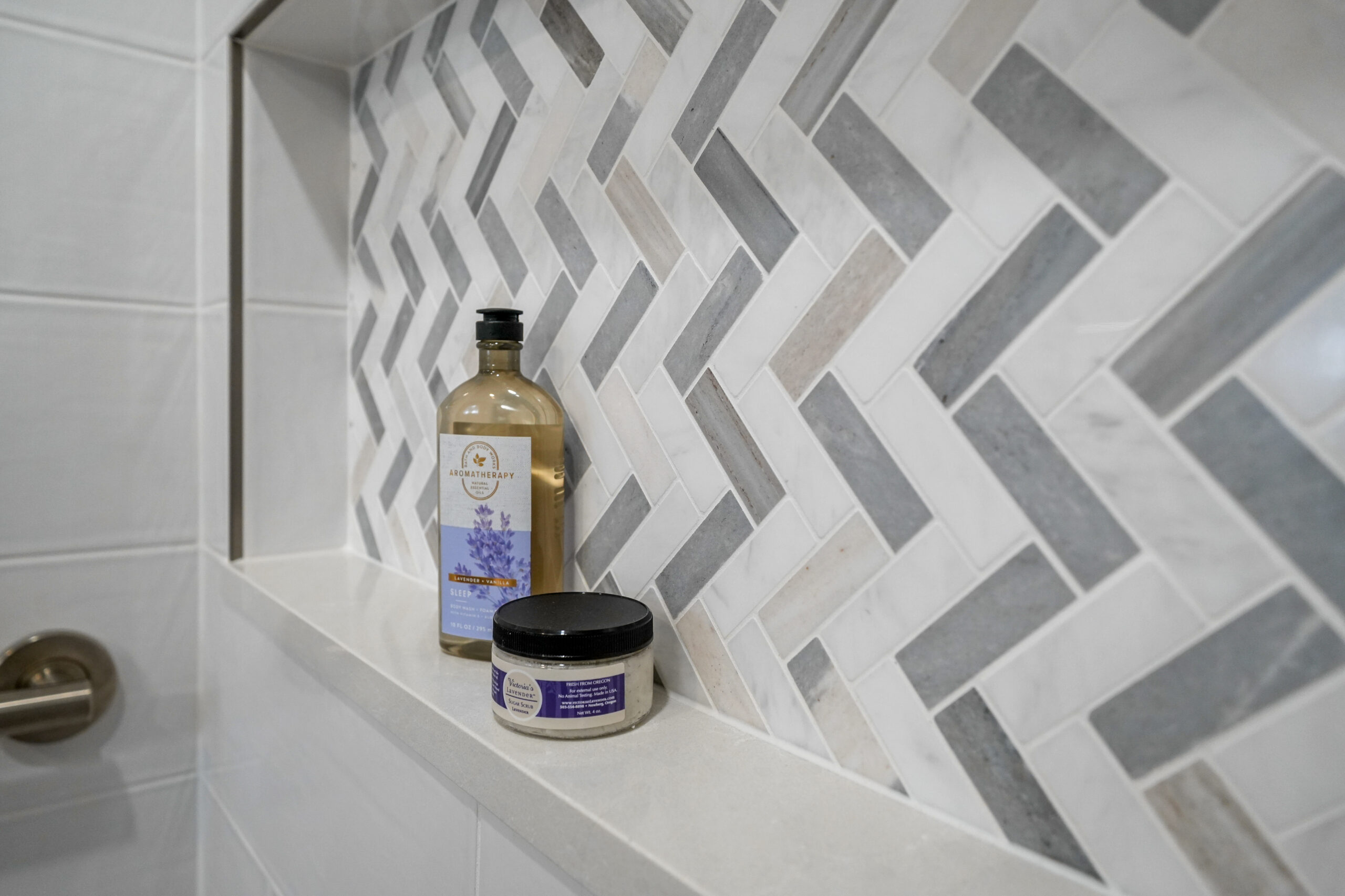 The hall bathroom was relocated across the hall from its original location and fully redesigned.