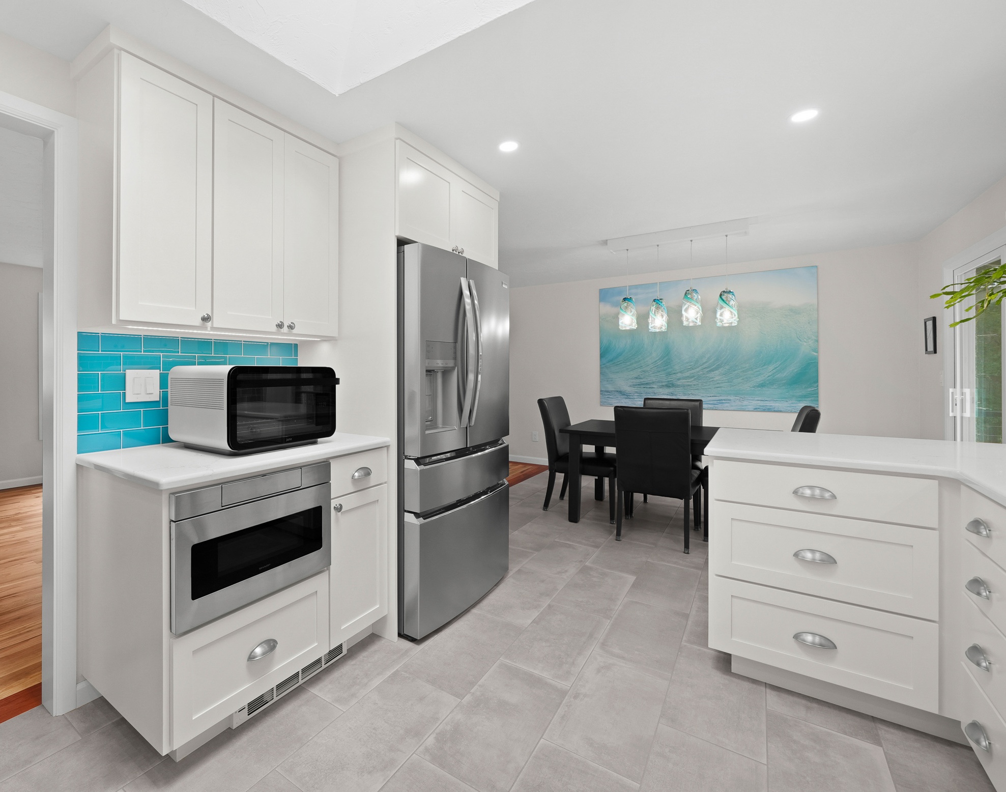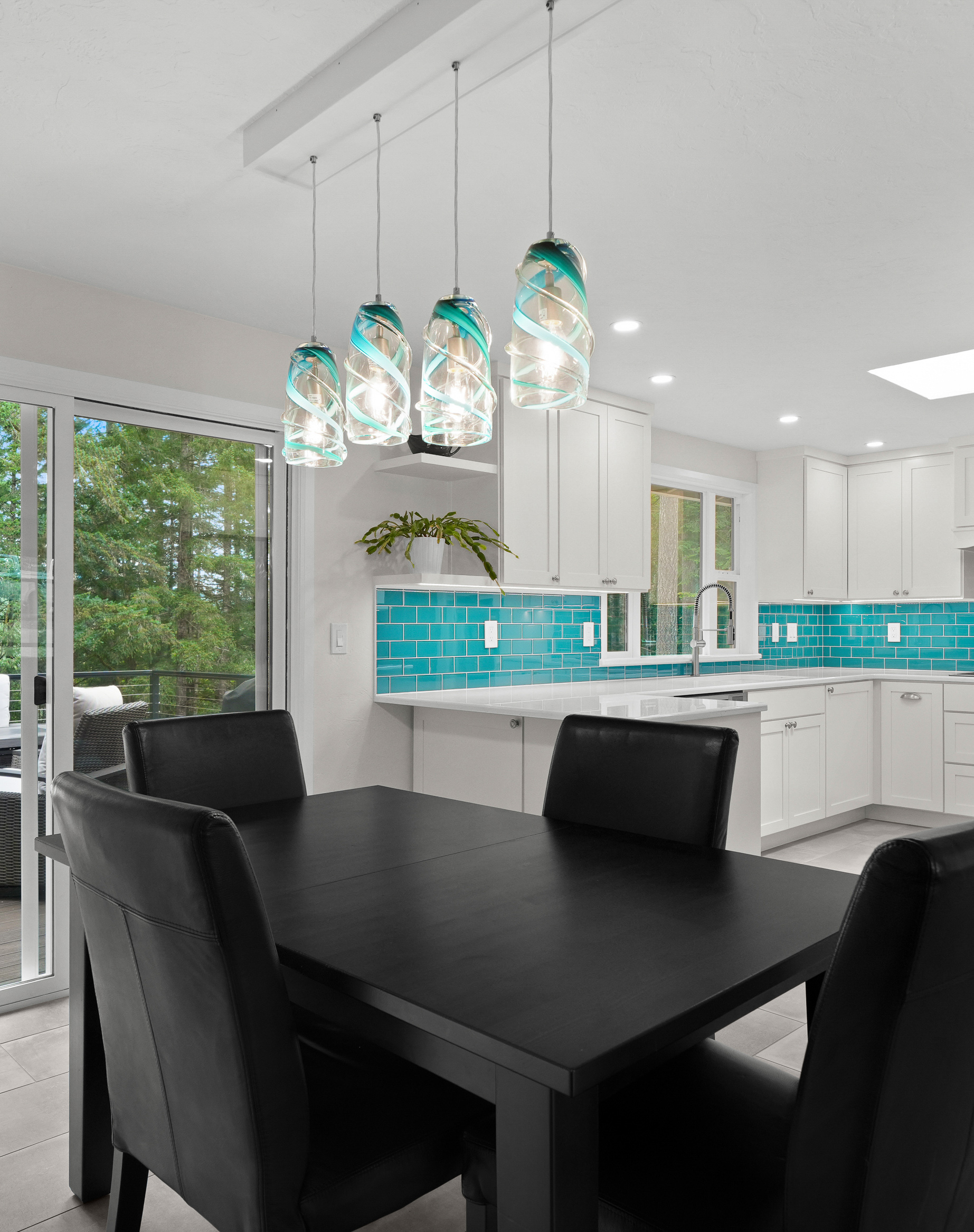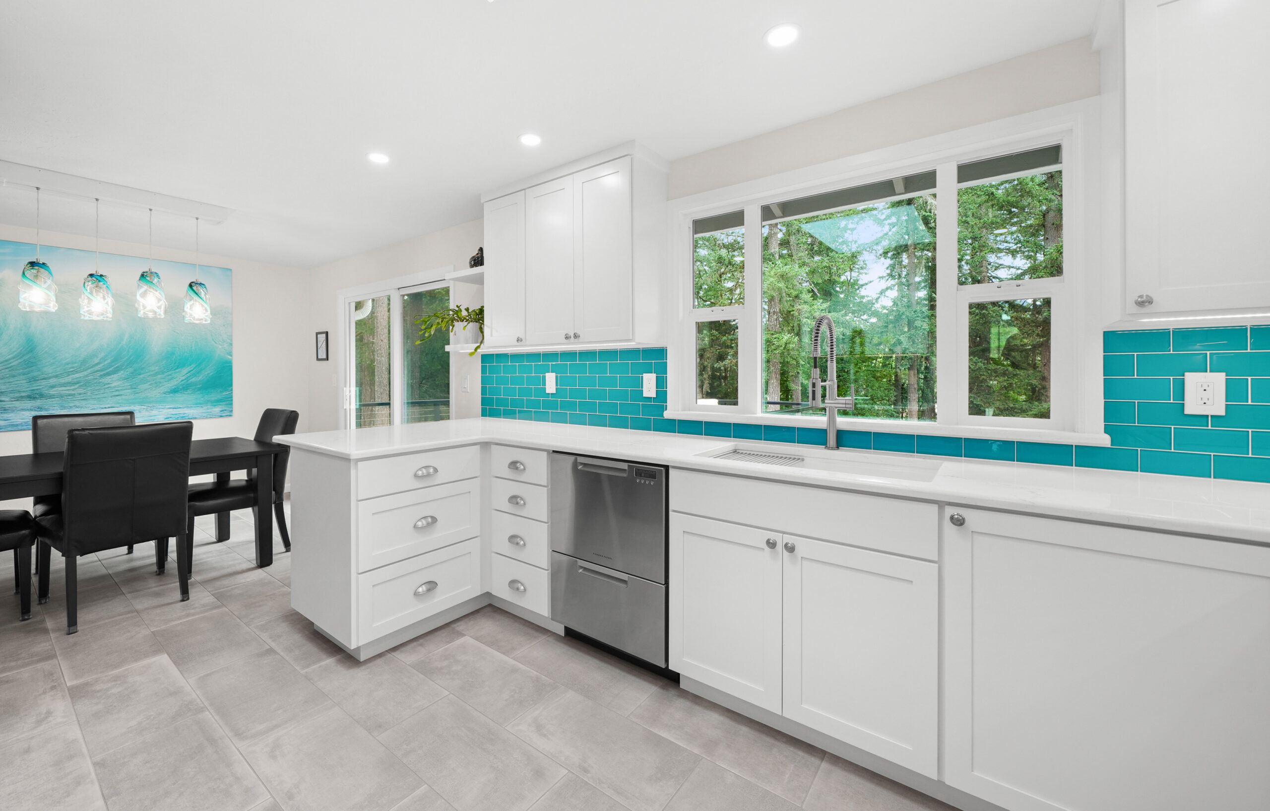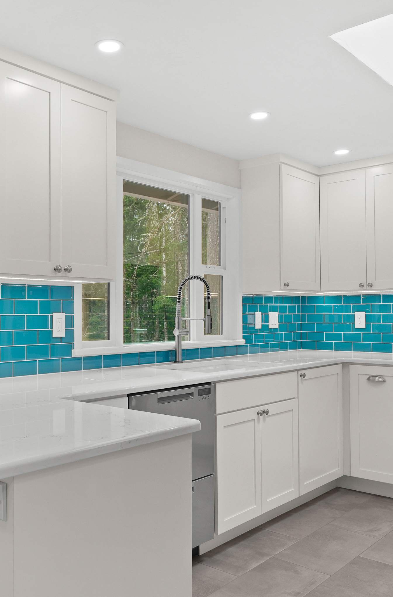 To complete the look, we installed quartz countertops, a quartz window sill, a full-height tile backsplash, and new large-format tile flooring through the kitchen and dining area. The bold backsplash color and finish selections were chosen to complement the dining light fixture and bring a playful coastal personality into the space without sacrificing timelessness.