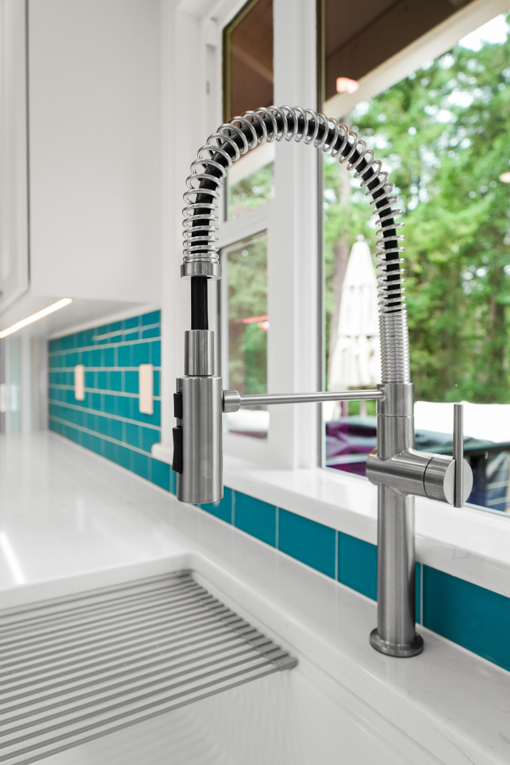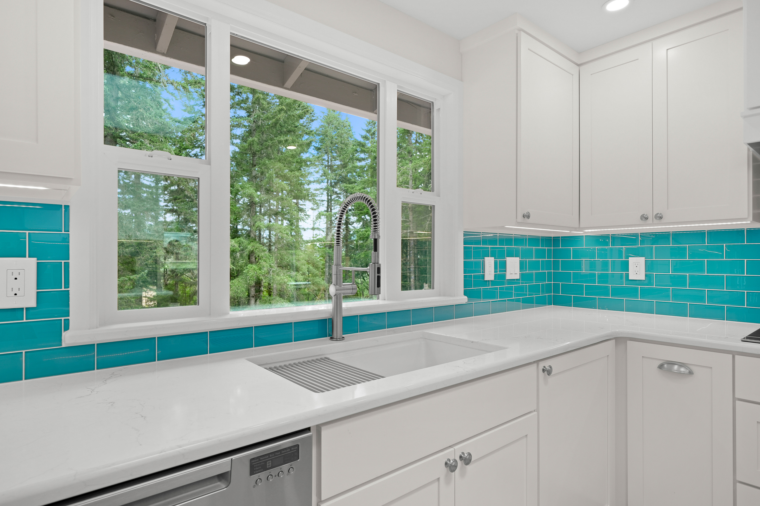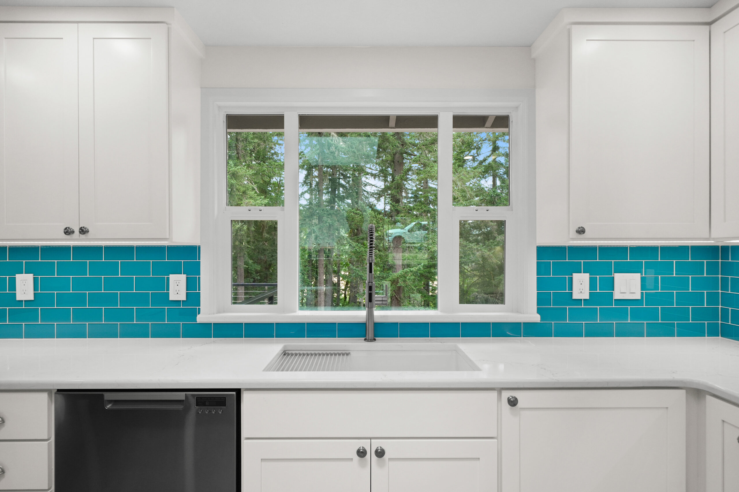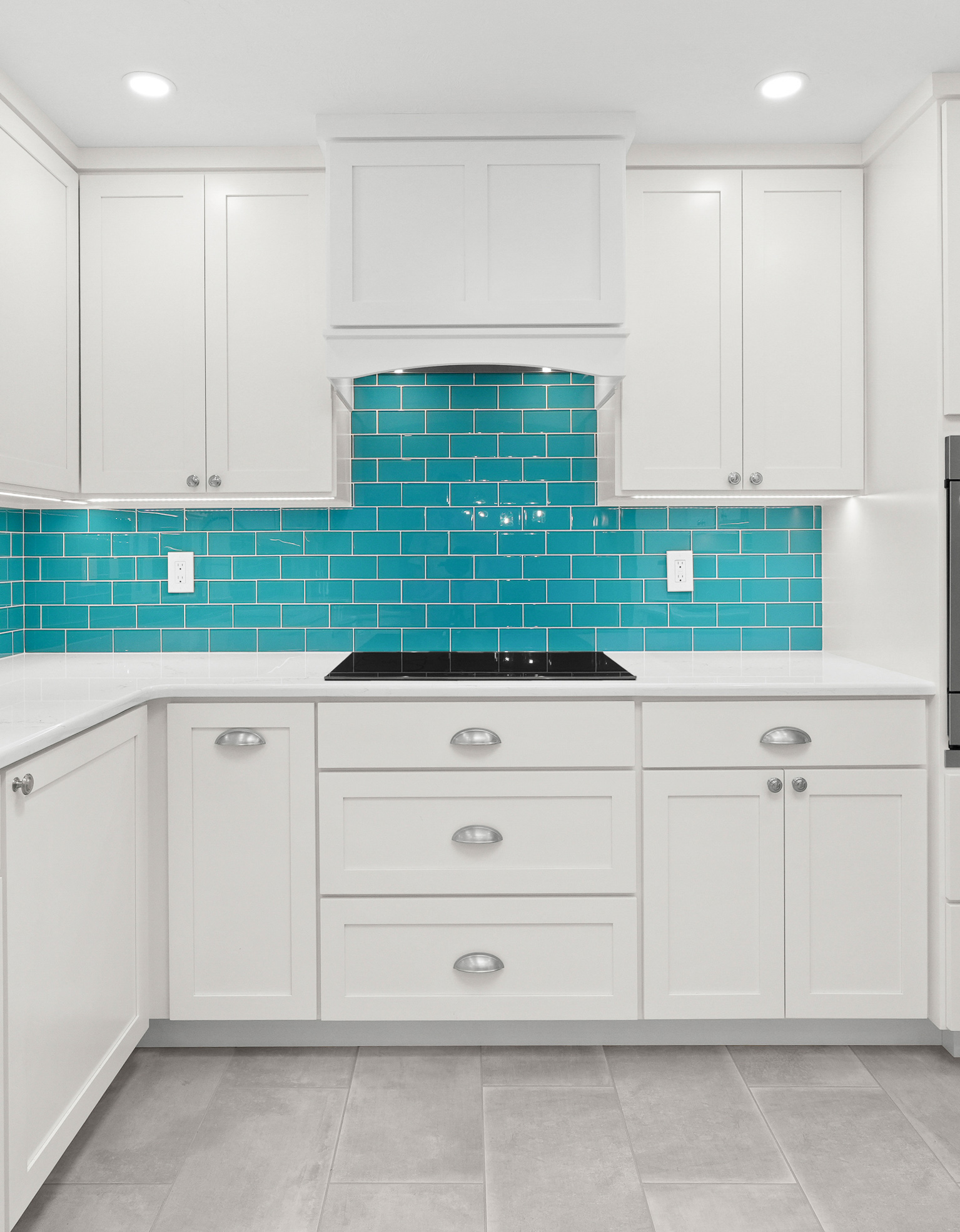 To complete the look, we installed quartz countertops, a quartz window sill, a full-height tile backsplash, and new large-format tile flooring through the kitchen and dining area. The bold backsplash color and finish selections were chosen to complement the dining light fixture and bring a playful coastal personality into the space without sacrificing timelessness.