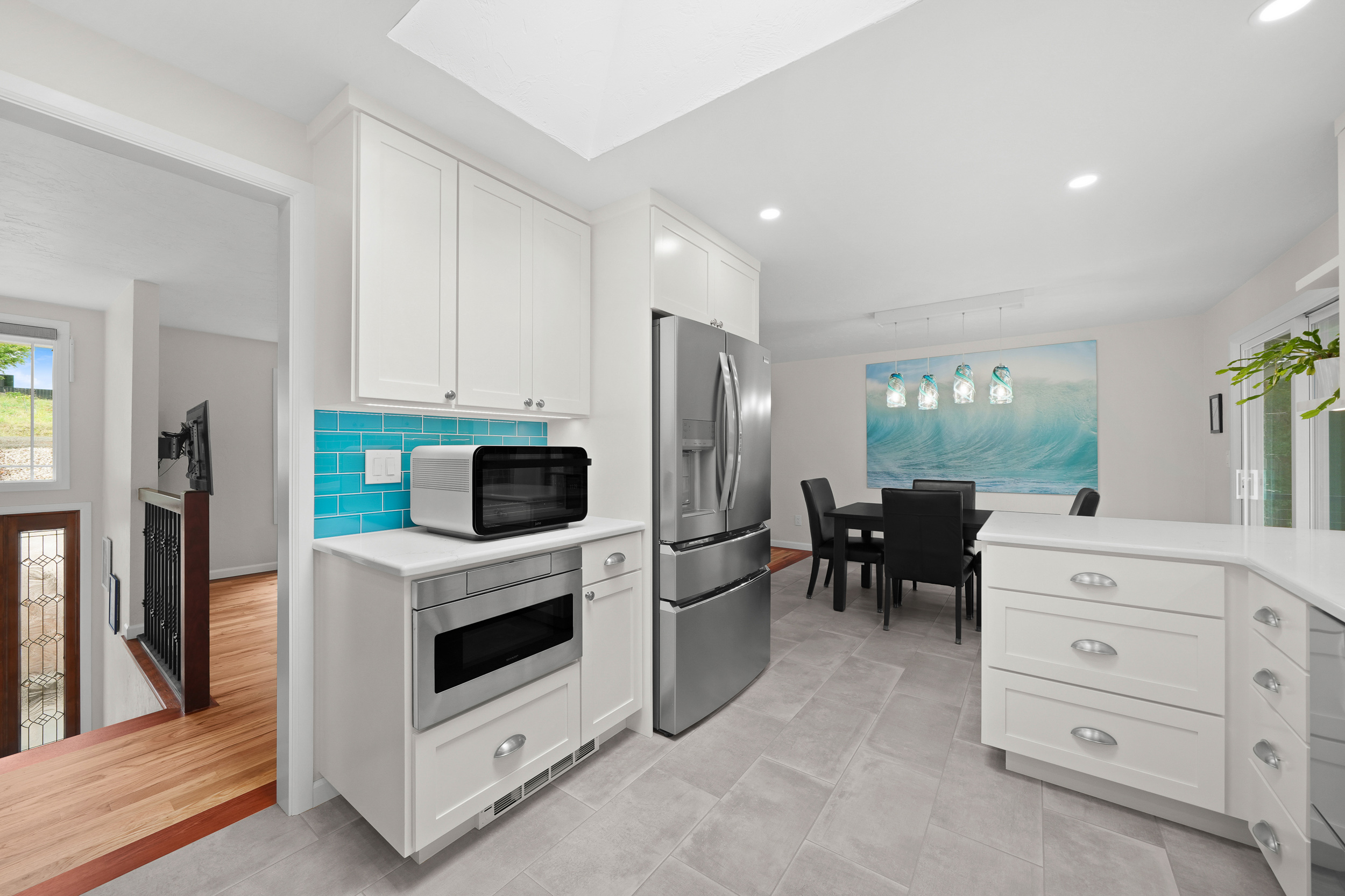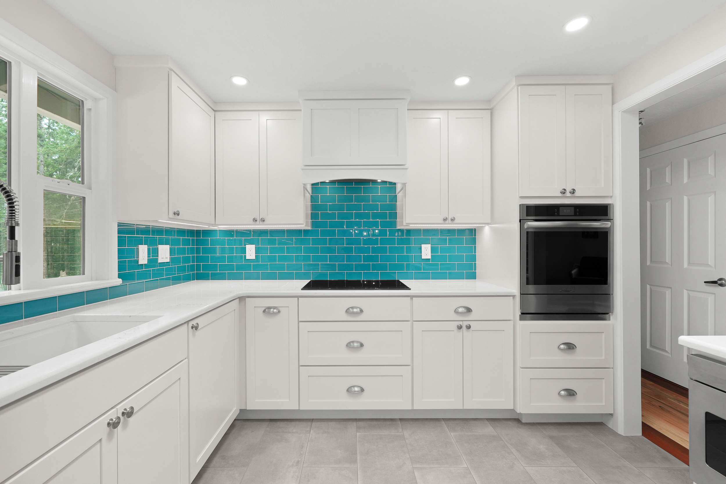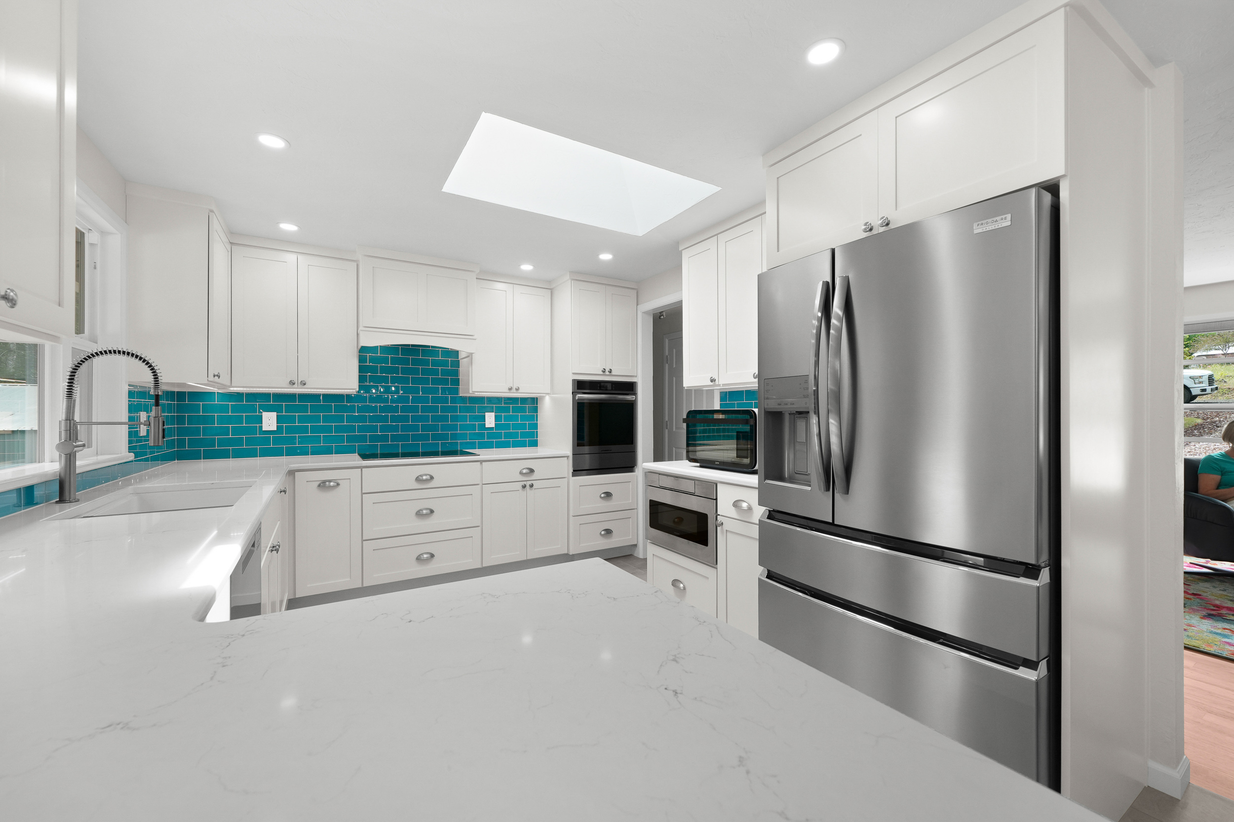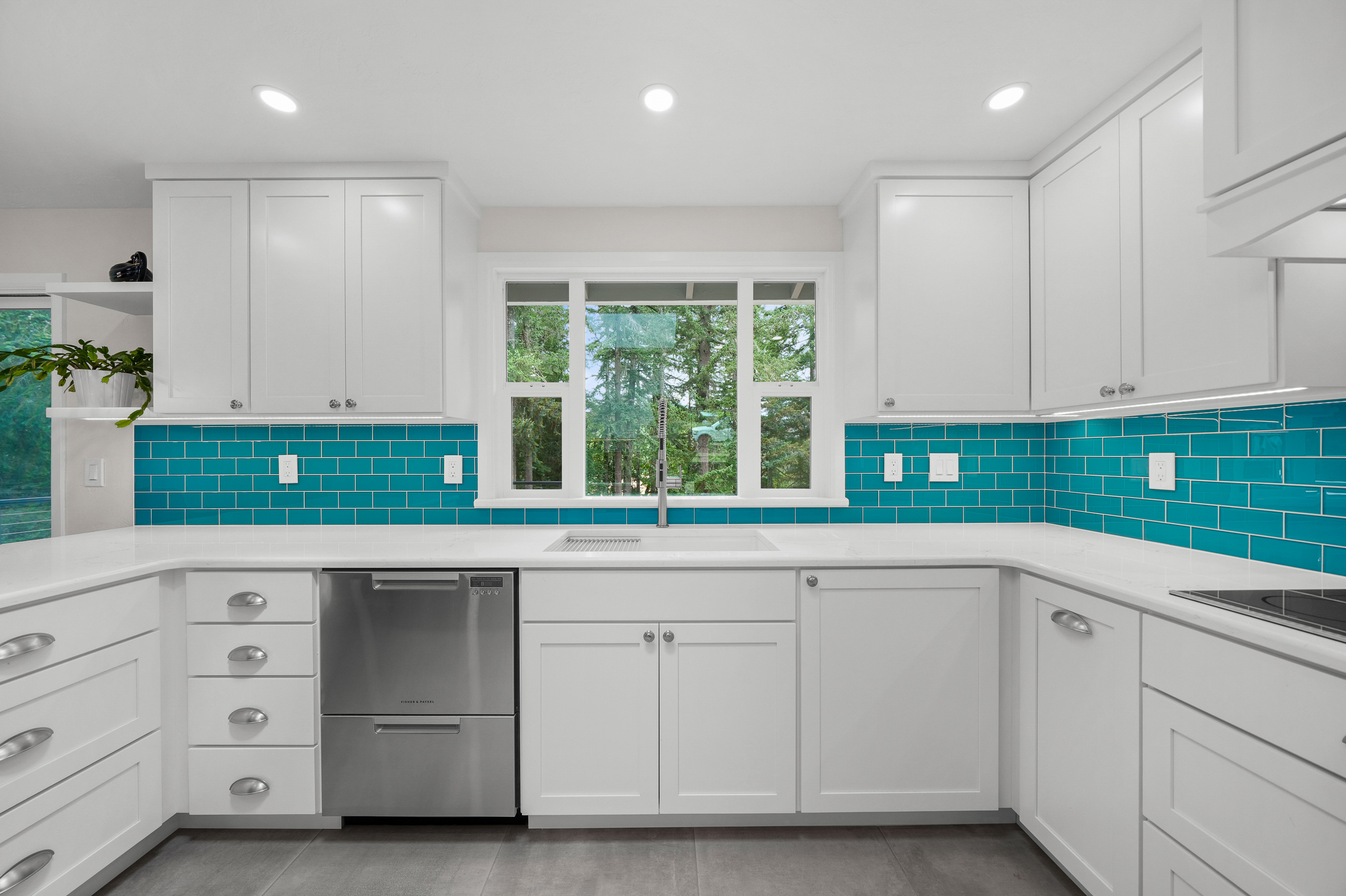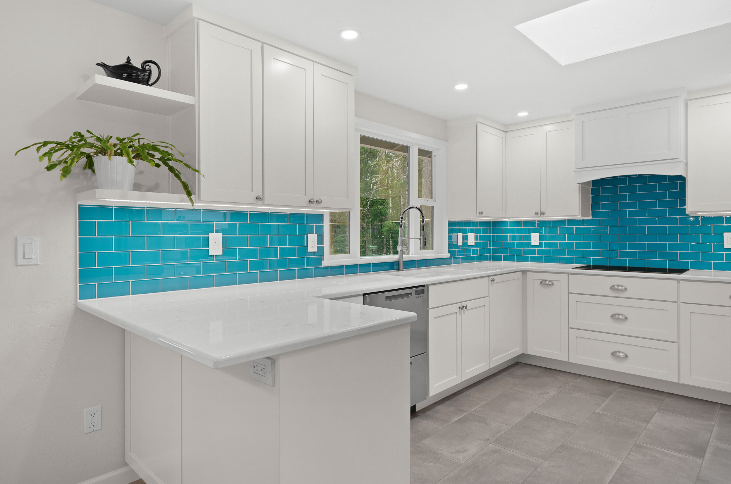 To complete the look, we installed quartz countertops, a quartz window sill, a full-height tile backsplash, and new large-format tile flooring through the kitchen and dining area. The bold backsplash color and finish selections were chosen to complement the dining light fixture and bring a playful coastal personality into the space without sacrificing timelessness.