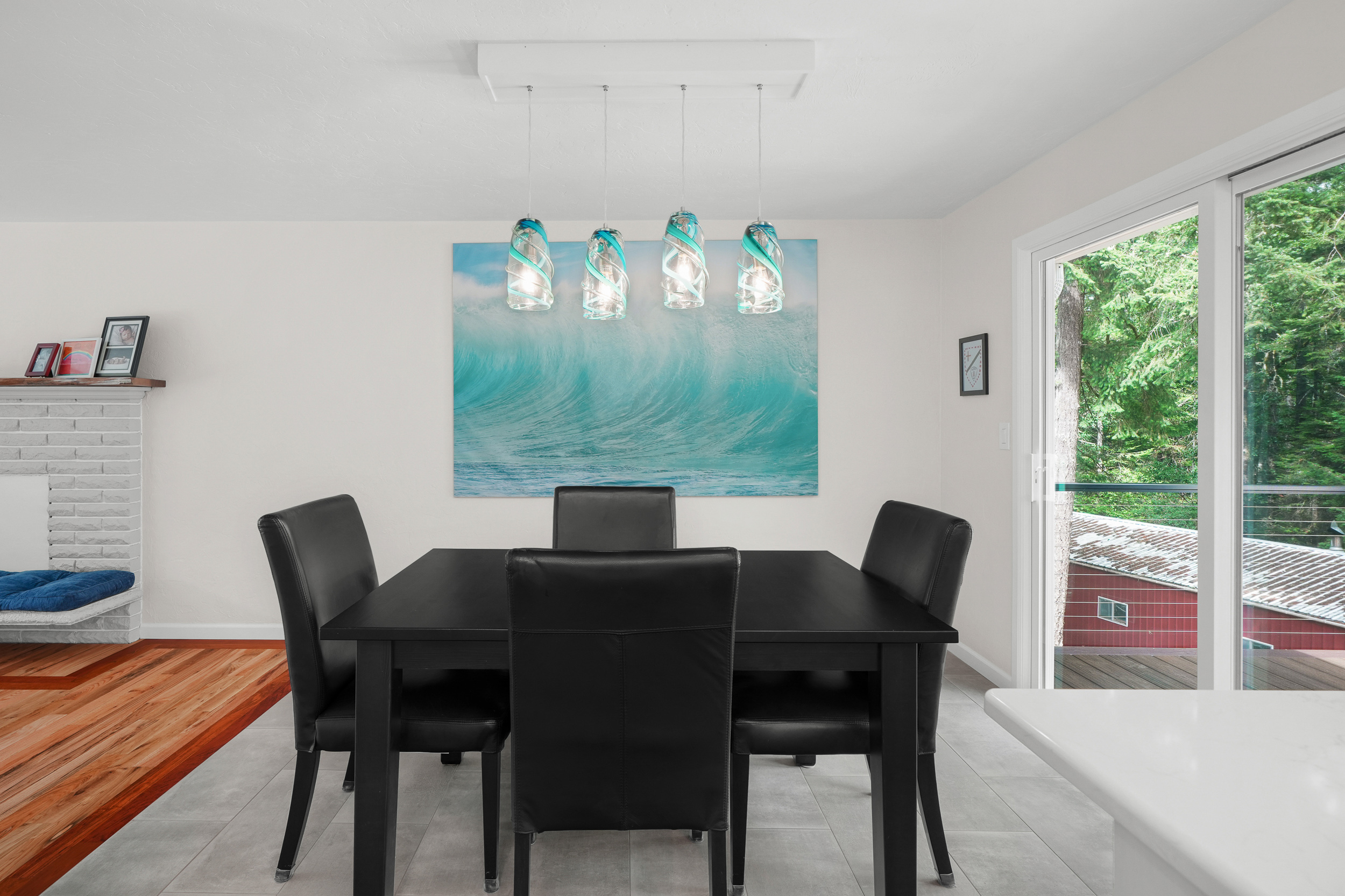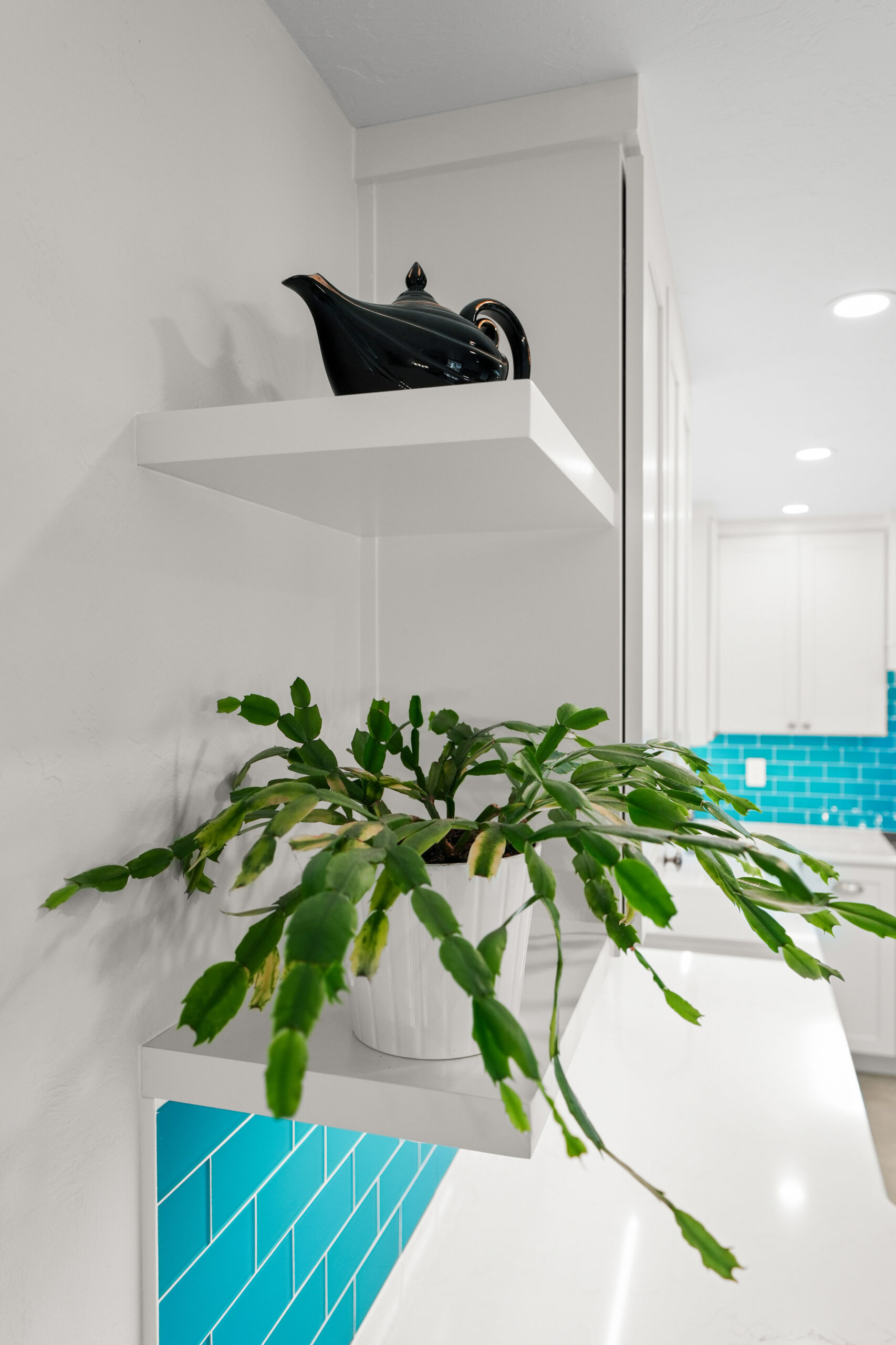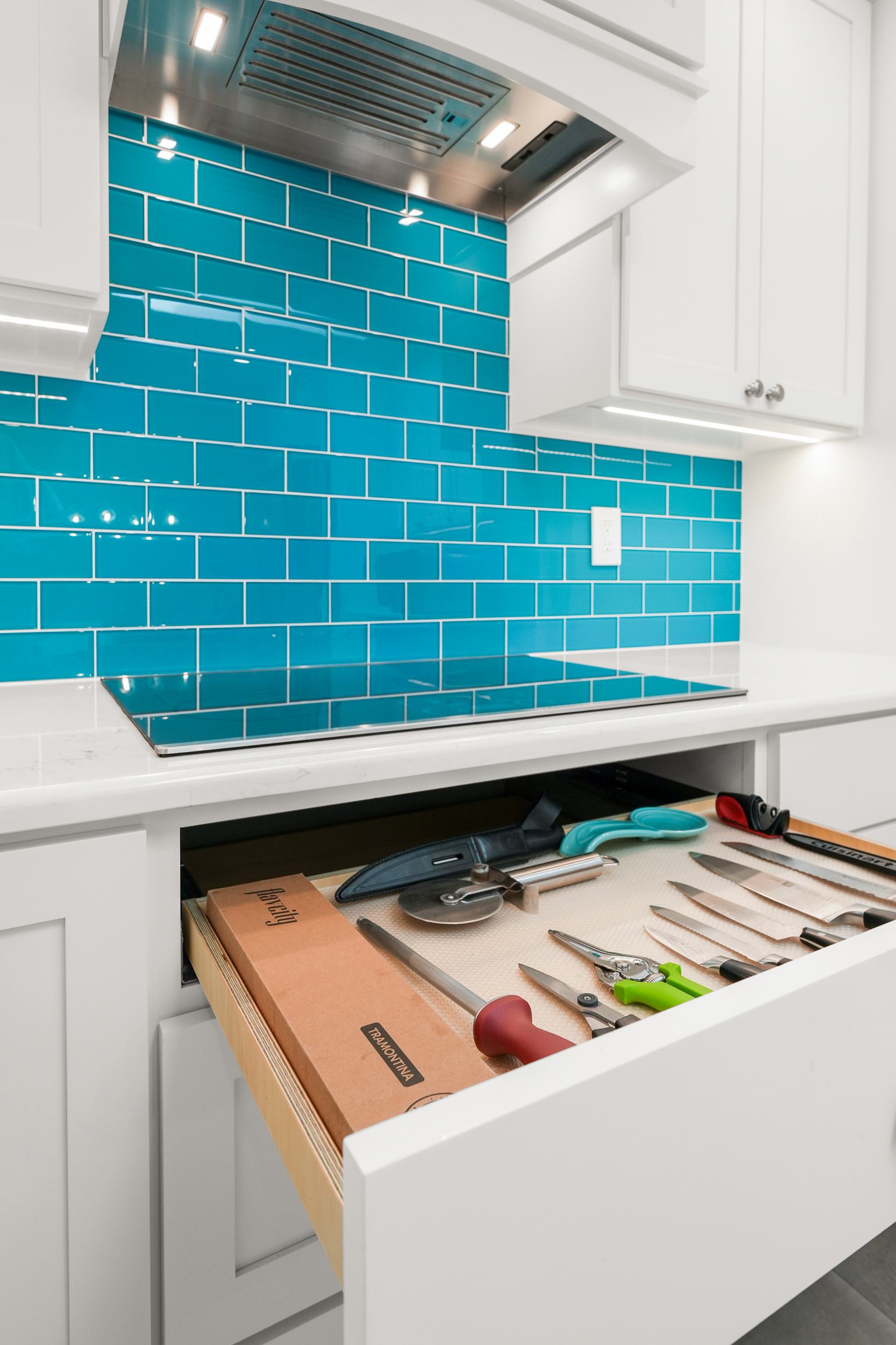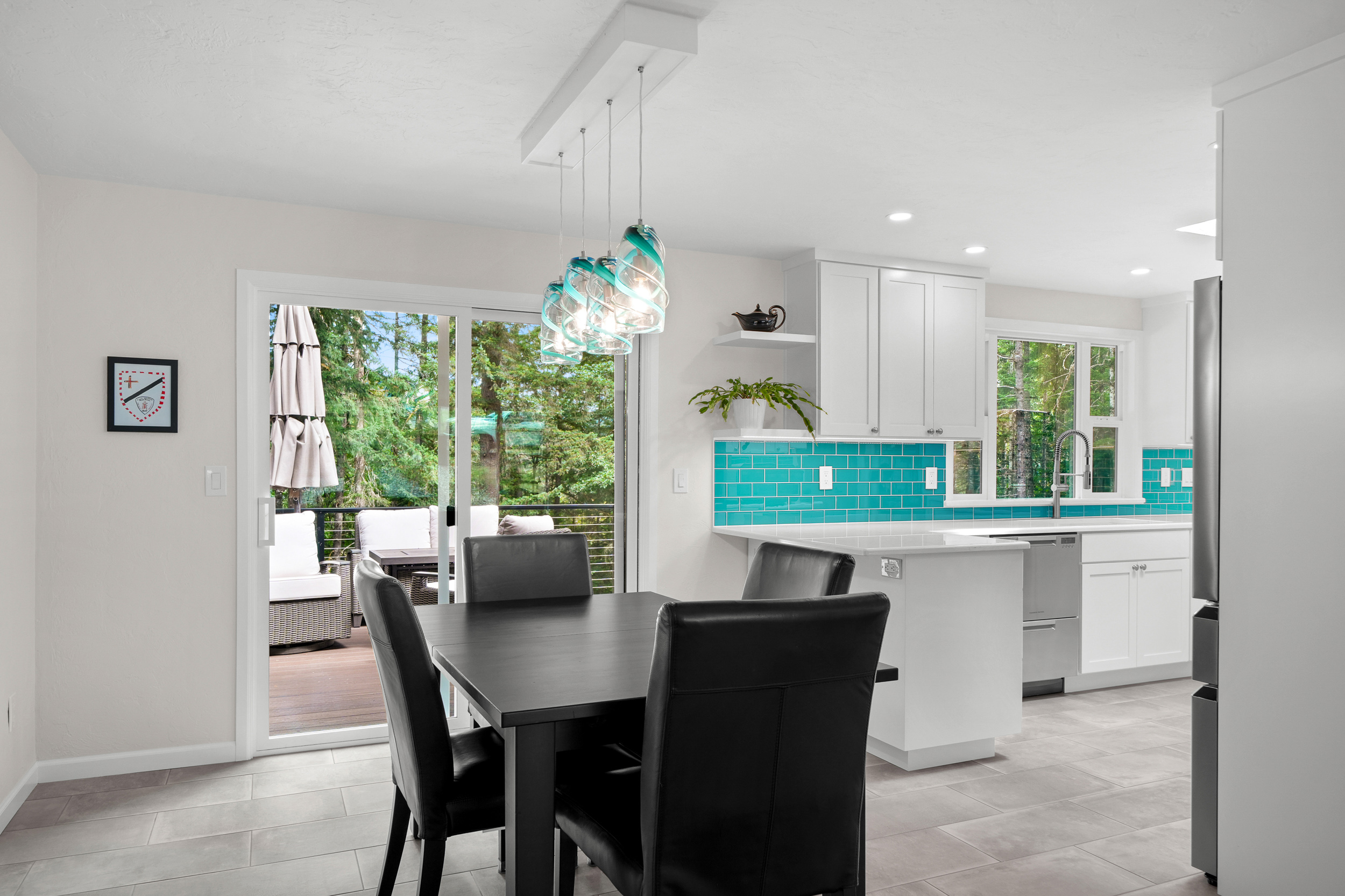 To complete the look, we installed quartz countertops, a quartz window sill, a full-height tile backsplash, and new large-format tile flooring through the kitchen and dining area. The bold backsplash color and finish selections were chosen to complement the dining light fixture and bring a playful coastal personality into the space without sacrificing timelessness.