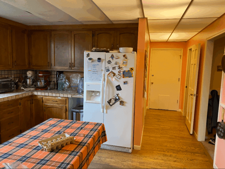 This couple in Corvallis, Oregon, contacted us to revamp their kitchen, which failed to serve their love for cooking and lacked the style and personality they desired. The space had an unappealing drop ceiling with dim fluorescent tube lights, a dishwasher held closed by a bungee cord, a non-functional double oven, along with difficult-to-open windows and sliding glass doors. The tiled countertops and make-shift island were inadequate, and the peninsula created an unnecessary barrier from the dining room. It was time for a change.