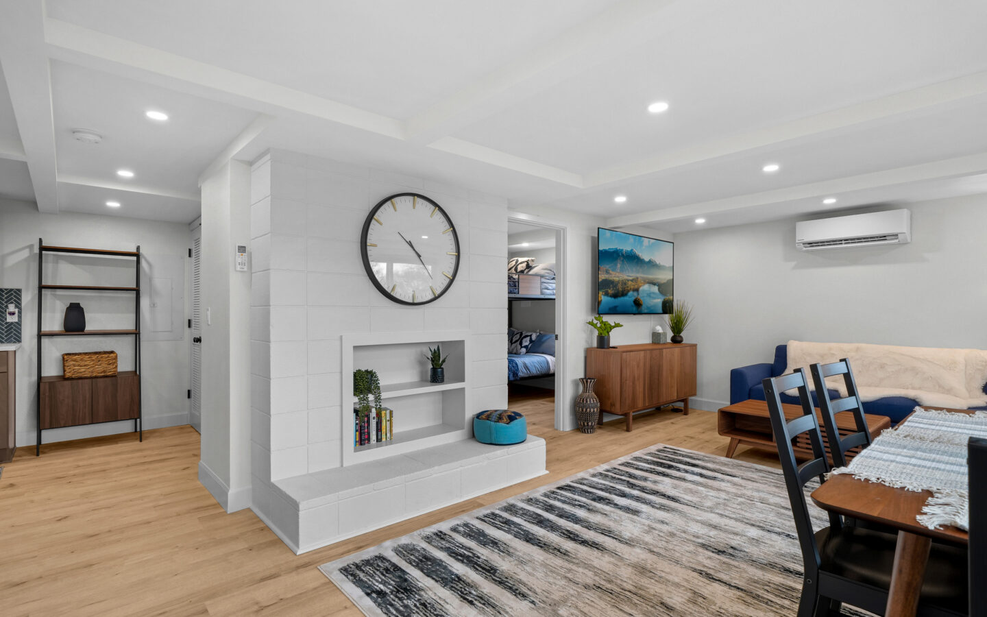We refinished the hardwood flooring, transformed the fireplace into a bookshelf, gave it a new coat of paint, and added all new furnishing to make the space feel like home again.